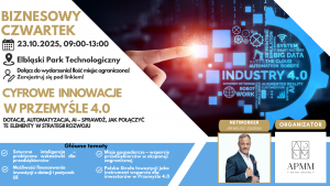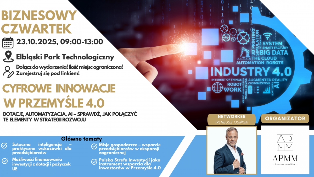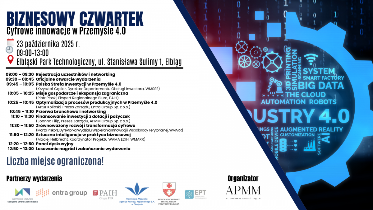 Już 23 października 2025 w przestrzeniach Elbląskiego Parku Technologicznego odbędzie się kolejna edycja wydarzenia organizowanego przez APMM Group – Biznesowy Czwartek.